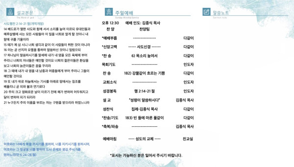 2024년 6월 2일 페이지 정보 작성자 산라몬밸리 댓글 0건 조회 3,668회 작성일 24-05-30 10:08 목록 본문 주일 주보 이전글2024년 6월 16일 24.06.14 다음글2024년 5월 26일 24.05.23 댓글 0 댓글목록 등록된 댓글이 없습니다. 목록