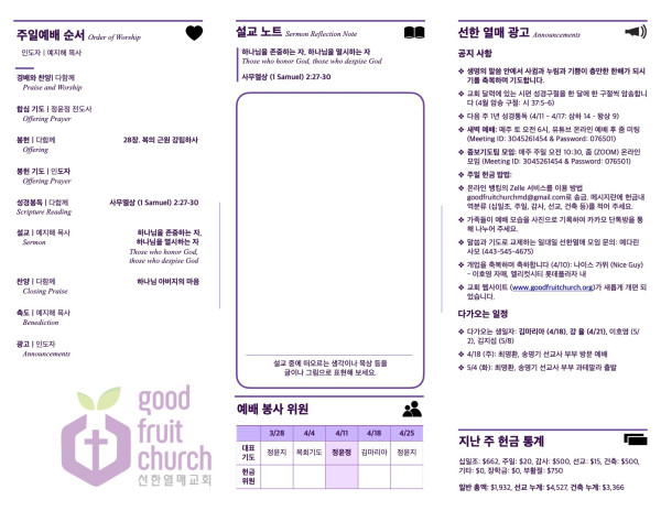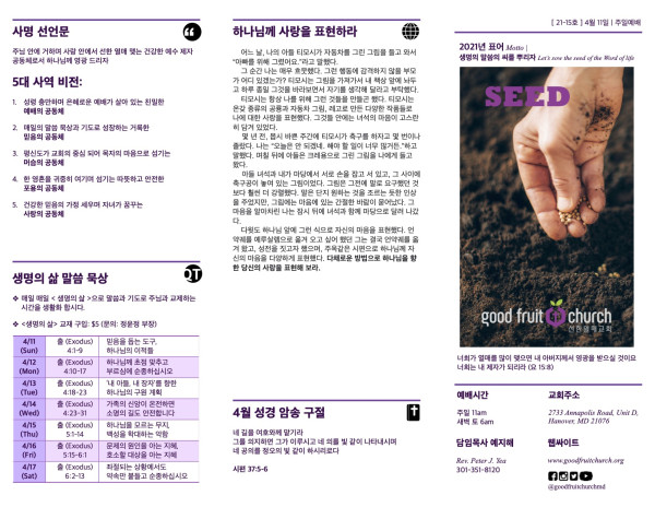 2021-04-11 페이지 정보 작성자 선한열매교회 댓글 0건 조회 4,111회 작성일 21-04-12 05:42 목록 본문 2021-04-11 주보 이전글2021-04-18 21.04.19 다음글2021-04-04 21.04.12 댓글 0 댓글목록 등록된 댓글이 없습니다. 목록