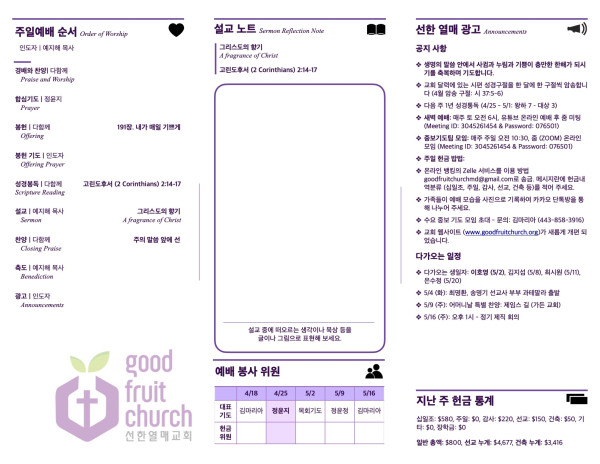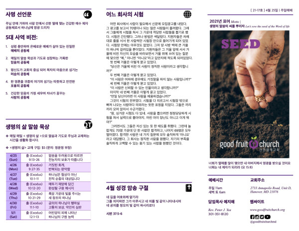2021-04-25 페이지 정보 작성자 선한열매교회 댓글 0건 조회 4,090회 작성일 21-04-26 04:52 목록 본문 2021-04-25 주보 이전글2021-05-02 21.05.01 다음글2021-04-18 21.04.19 댓글 0 댓글목록 등록된 댓글이 없습니다. 목록