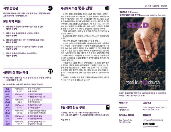 2021-06-06 페이지 정보 작성자 선한열매교회 댓글 0건 조회 4,083회 작성일 21-06-07 17:26 목록 본문 2021-06-06 주보 이전글2021-06-13 21.06.12 다음글2021-05-30 21.05.29 댓글 0 댓글목록 등록된 댓글이 없습니다. 목록