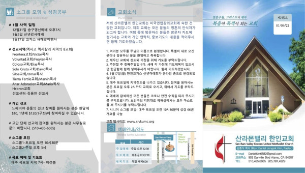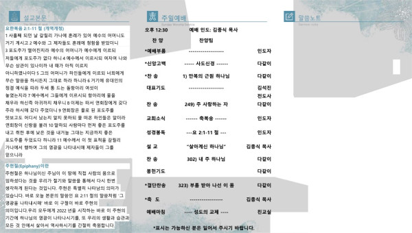 2022년 1월 9일 주현후 첫째주일 페이지 정보 작성자 산라몬밸리 댓글 0건 조회 7,659회 작성일 22-01-07 13:51 목록 본문 주일 주보 이전글2022년 1월16일 주현 후 둘째 주일 22.01.14 다음글2022년 1월 2일 신년감사 21.12.31 댓글 0 댓글목록 등록된 댓글이 없습니다. 목록