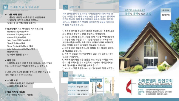 2021년 12월 19일 성탄주일예배 페이지 정보 작성자 산라몬밸리 댓글 0건 조회 7,694회 작성일 21-12-16 13:49 목록 본문 대강절 넷째 주일이자 성탄주일예배 주보 이전글2021년 12월 24일 성탄절 이브 21.12.23 다음글2021년 12월 12일 대강절 셋째 주일 21.12.09 댓글 0 댓글목록 등록된 댓글이 없습니다. 목록