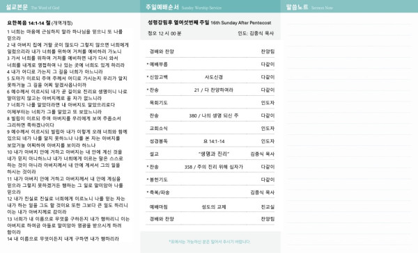 2024년 9월 8일 페이지 정보 작성자 산라몬밸리 댓글 0건 조회 3,278회 작성일 24-09-04 11:55 목록 본문 주일 주보 이전글2024년 9월 15일 24.09.11 다음글2024년 9월 1일 24.08.29 댓글 0 댓글목록 등록된 댓글이 없습니다. 목록