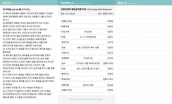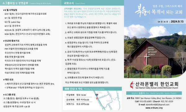 2024년 9월 15일 페이지 정보 작성자 산라몬밸리 댓글 0건 조회 4,240회 작성일 24-09-11 13:21 목록 본문 주일 주보 이전글2024년 9월 22일 24.09.19 다음글2024년 9월 8일 24.09.04 댓글 0 댓글목록 등록된 댓글이 없습니다. 목록