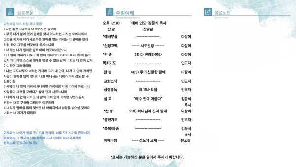 2024년 4월 28일 페이지 정보 작성자 산라몬밸리 댓글 0건 조회 3,791회 작성일 24-04-24 09:12 목록 본문 주일 주보 이전글2024년 5월 5일 24.05.02 다음글2024년 4월 21일 24.04.18 댓글 0 댓글목록 등록된 댓글이 없습니다. 목록