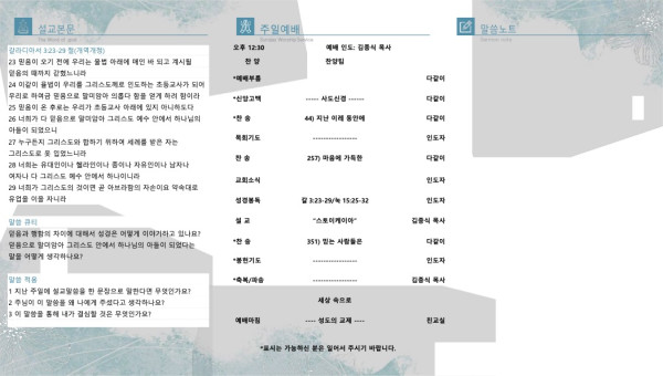 2023년 8월 27일 페이지 정보 작성자 산라몬밸리 댓글 0건 조회 4,559회 작성일 23-08-25 14:19 목록 본문 주일 주보 이전글2023년 9월 3일 23.09.01 다음글2023년 8월20일 23.08.15 댓글 0 댓글목록 등록된 댓글이 없습니다. 목록