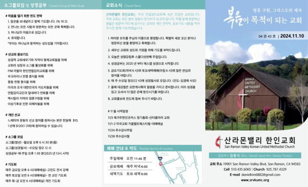 2024년 11월 10일 주보 페이지 정보 작성자 산라몬밸리 댓글 0건 조회 3,974회 작성일 24-11-10 08:22 목록 본문 주일 주보 이전글2024년 11월 17일 24.11.16 다음글2024년 10월 27일 24.10.23 댓글 0 댓글목록 등록된 댓글이 없습니다. 목록