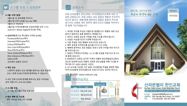 2022년 4월3일 페이지 정보 작성자 산라몬밸리 댓글 0건 조회 6,804회 작성일 22-04-01 05:57 목록 본문 주일주보 이전글4월10일 종려주일 22.04.08 다음글2022년 3월27일 22.03.26 댓글 0 댓글목록 등록된 댓글이 없습니다. 목록
