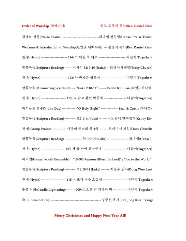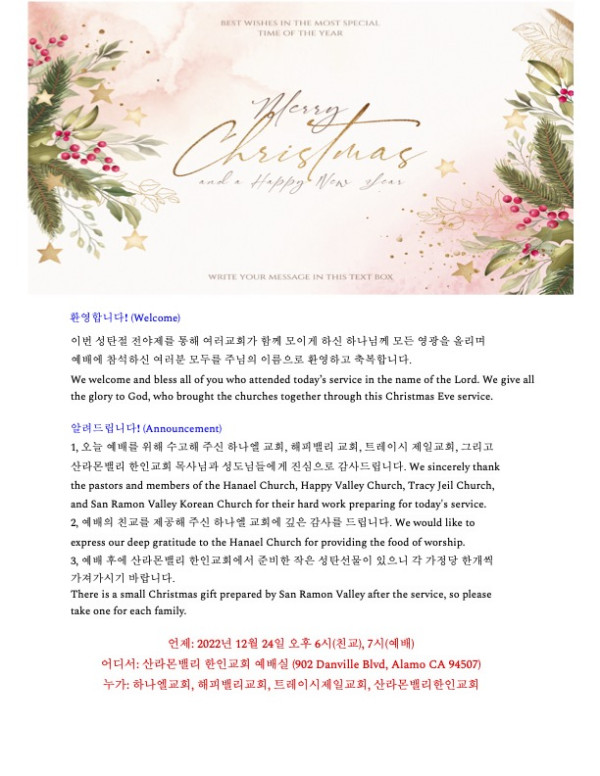 성탄전야 합동 감사찬양예배 페이지 정보 작성자 산라몬밸리 댓글 0건 조회 2,586회 작성일 22-12-25 16:45 목록 본문 하나엘, 해피밸리, 트레이시제일, 산라몬밸리 한인교회 이전글2023년 1월 1일 22.12.29 다음글2022년 12월 18일 22.12.13 댓글 0 댓글목록 등록된 댓글이 없습니다. 목록